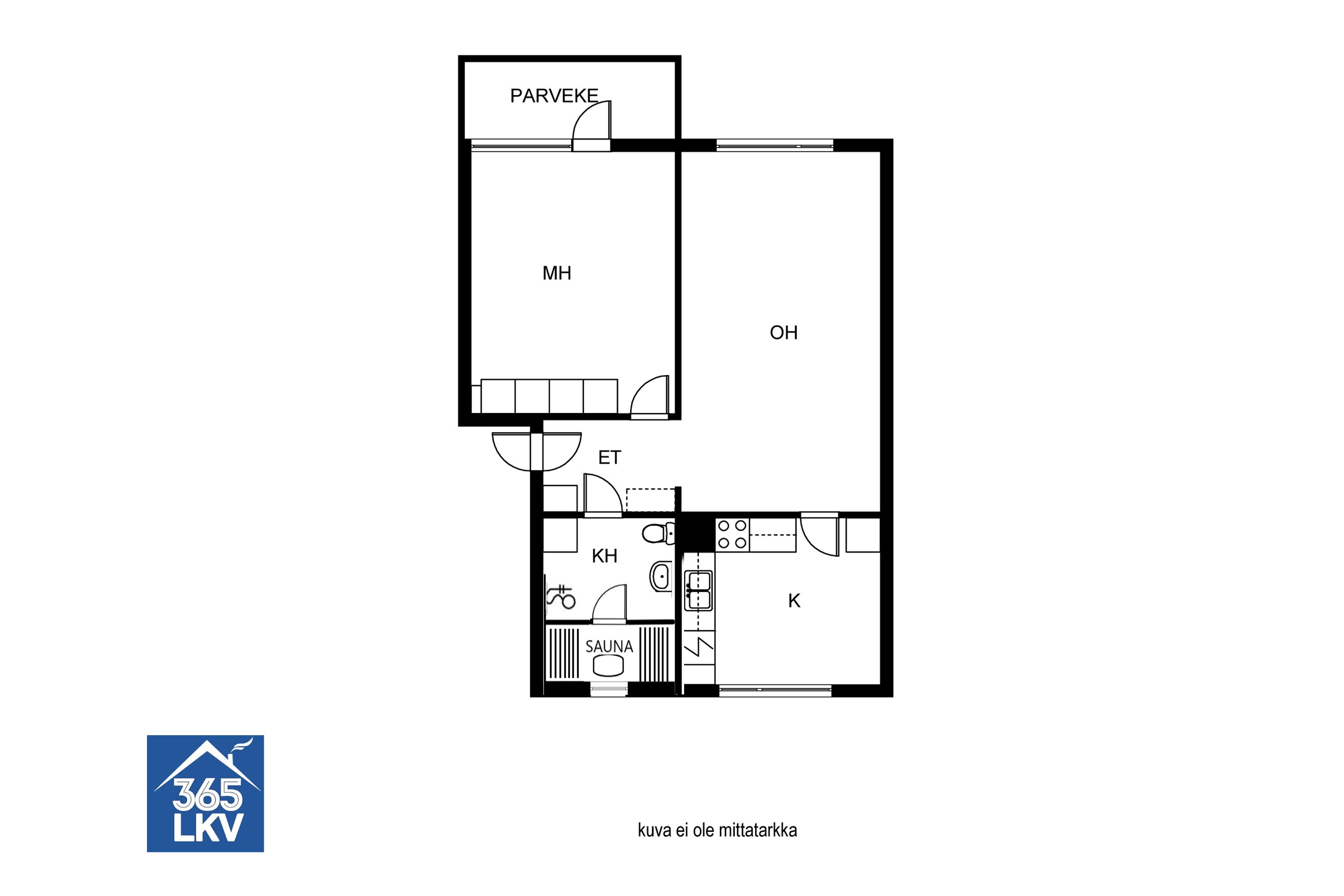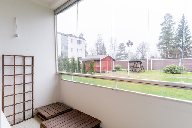 - Ei tarkistusmitattu. Pinta-alat saattavat tämän ikäisissä kohteissa (valmistunut ennen 1.1.1992) poiketa olennaisestikin asuinrakennusten nykyisten mittaustapojen ja standardien (SFS 5139) mukaan laskettavasta asuintilojen pinta-alasta. Pinta-ala voi siis olla edellä mainittua pienempi tai suurempi. Kohtaan muiden tilojen pinta-ala on merkitty iso lasitettu parveke.