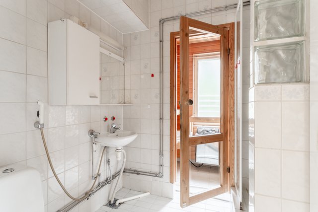 - Tilava kylpyhuone, jonne mahtuu täyskokoinen pesukone ja vaikka pesutorni. Kylpyhuoneessa on tehty jälkikäteen sauna. Osakas vastaa saunan kunnossapidosta ja myös sen purkamisesta ja uudelleenrakentamisesta jos jokin yhtiön saneeraus sen vaatisi.