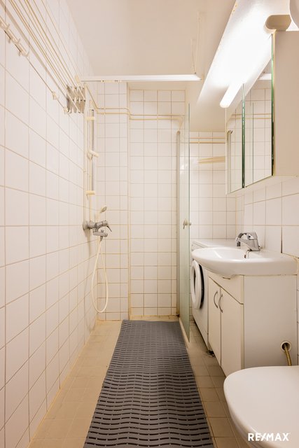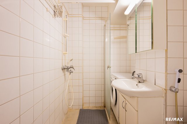- WC-istuin, suihku, suihkuseinä, pesukoneliitäntä, pesuallas, peilikaappi, ja allaskaappi