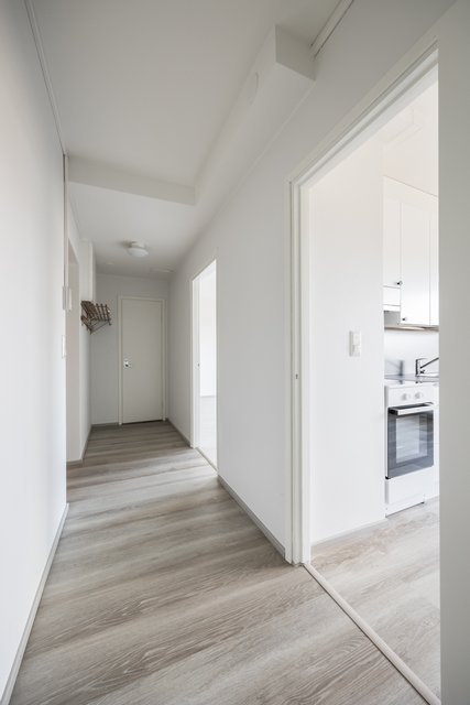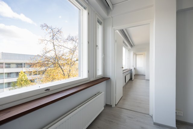 Valoisassa viidennen kerroksen asunnossa on kaksi makuuhuonetta, joiden pinnat on juuri uusittu. Keittiö on saanut täysin uuden ilmeen lokakuussa 2025, ja sieltä löytyy nyt modernit kodinkoneet sekä tyylikkäät valkoiset kaapistot. Olohuoneessa ja makuuhuoneissa on kauniit laminaattilattiat, jotka luovat yhtenäisen ja modernin ilmeen koko asuntoon.