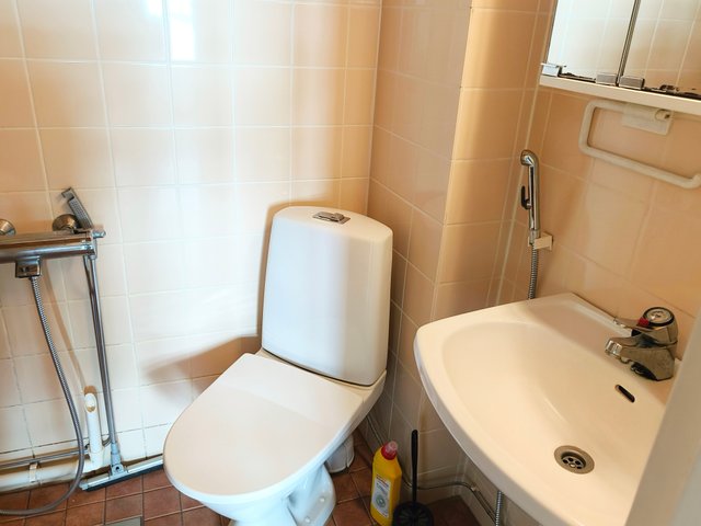 - -Suihku, wc-istuin, käsienpesuallas, pk-liitäntä -Seinät ja lattia laatoitettu