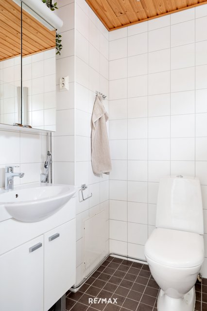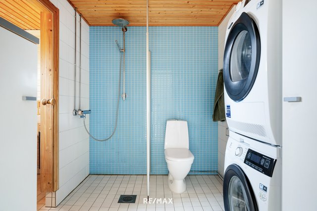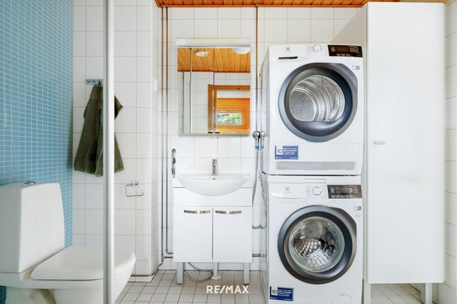 - WC-istuin, suihku, suihkuseinä, lattialämmitys, peilikaappi, pesuallas, allaskaappi, bidee-suihku, ja pesukoneliitäntä