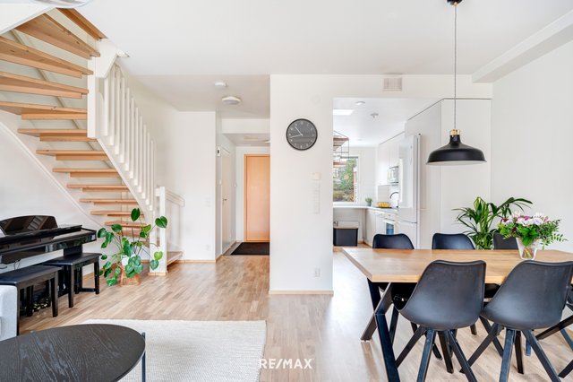 Bembölen Vesirattaanmäessä sijaitseva viehättävä rivitaloasunto tarjoaa mukavaa asumista kahdessa kerroksessa. Tämä vuonna 2012 valmistunut koti on erittäin siistissä kunnossa ja tarjoaa tilavat huoneet, joissa on korkea huonekorkeus ja runsaasti luonnonvaloa. Asunnon yläkerrassa on kolme makuuhuonetta, kylpyhuone, sauna ja parveke, alakerrassa on avoin olohuone-ruokailutila-yhdistelmä, keittiö ja toinen kylpyhuone, joka helpottaa arjen sujumista.