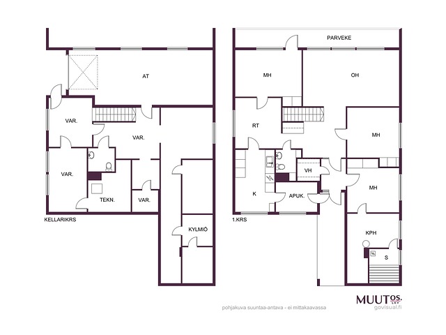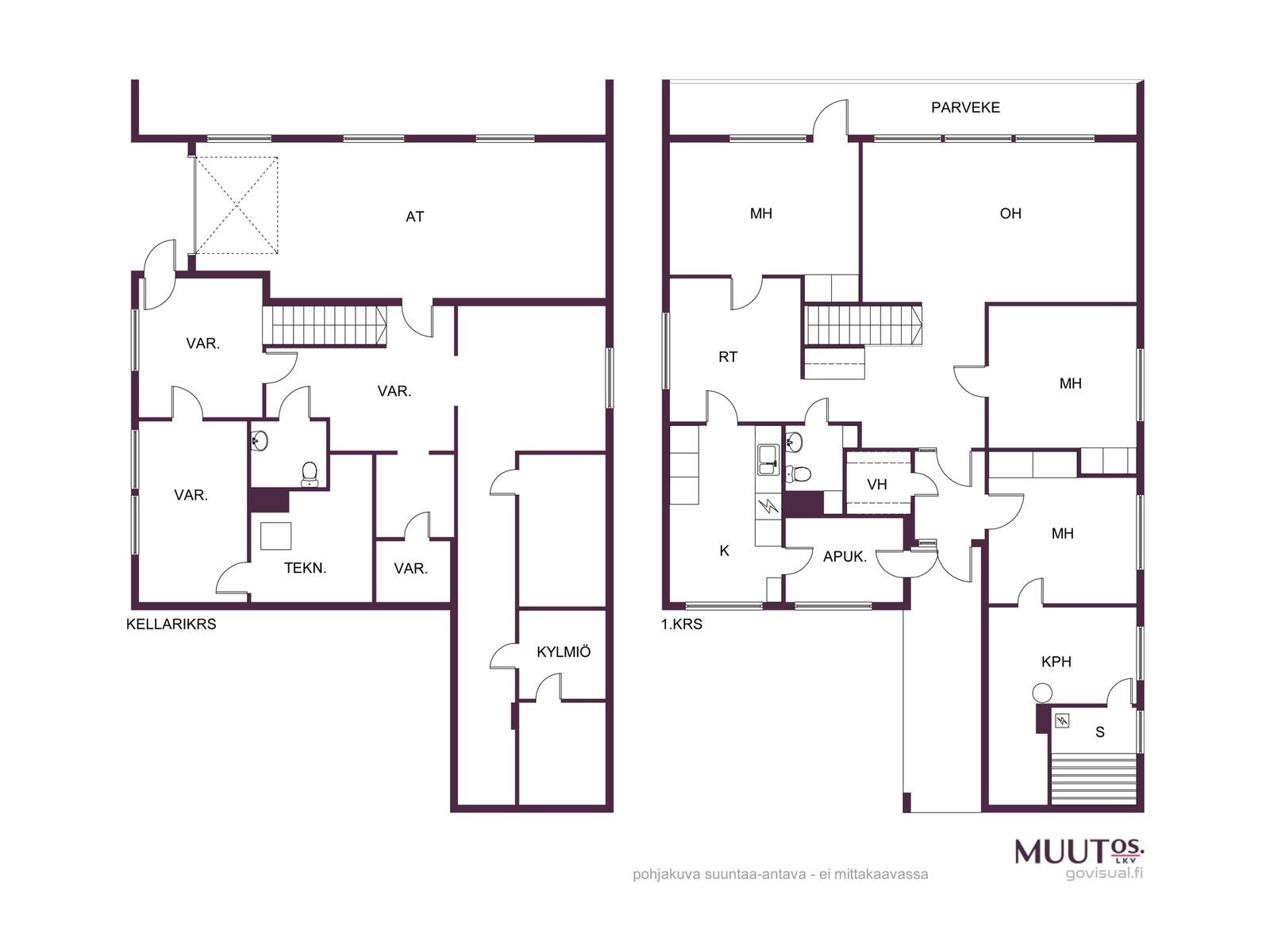 - Pinta-alat perustuvat myyjältä saatuihin tietoihin ja rakennuspiirustuksista laskettuihin arvioihin. Pinta-aloja ei ole tarkistusmitattu, mitattaessa pinta-alat saattavat olla ilmoitettua suurempia tai pienempiä. Hinta ei ole pinta-alaperusteinen. Rakennuspiirustusten mukainen asuinrakennuksen rak.ala 150 m², kerrosala 153 m². Asuintilojen pinta-ala on laskettu rakennuspiirustuksista ja siihen on huomioitu kaikki asuinkäytössä olevat tilat, muihin tiloihin on laskettu varastotilat, tekniset tilat, autotalli.