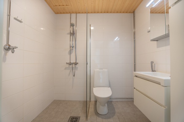 - Peilikaappi, suihkuseinä, allaskaappi, suihku, pesukoneliitäntä, lattialämmitys, ja wc-istuin