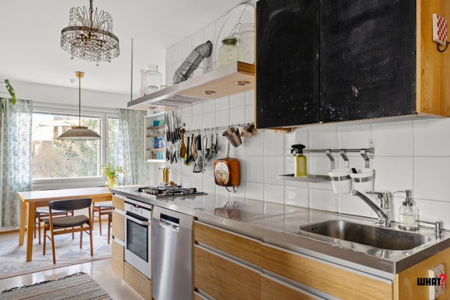 Keittiö on käytännöllinen ja palvelee vaativampaakin kotikokkia: kaasuliesi tarjoaa erinomaisen ruoanlaittokokemuksen, ja tilaan mahtuu hyvin isompikin ruokailuryhmä. Arkea sujuvoittavat erillinen wc sekä kylpyhuone, ja parveke. Asuntoon kuuluu lisäksi oma autotalli, joka on harvinainen ja arvokas etu alueella.