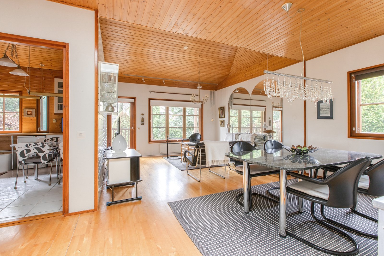 - Parketti koivupuuta. Kaunis, korkea vinokattorakenne.