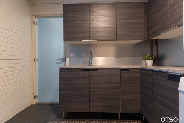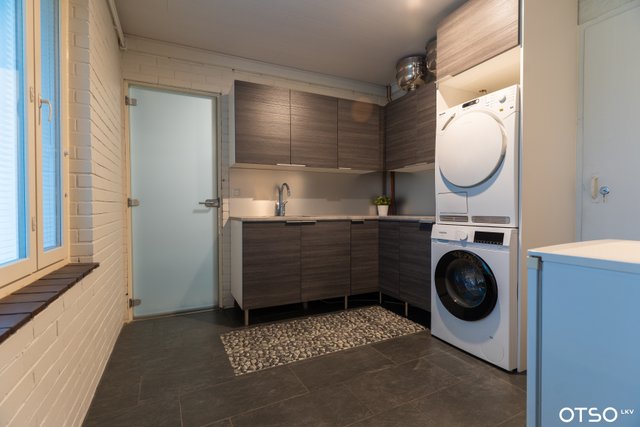 - Pesukoneliitäntä, lattialämmitys, pesuallas, lattiakaivo, pöytätaso, ja tila pesutornille