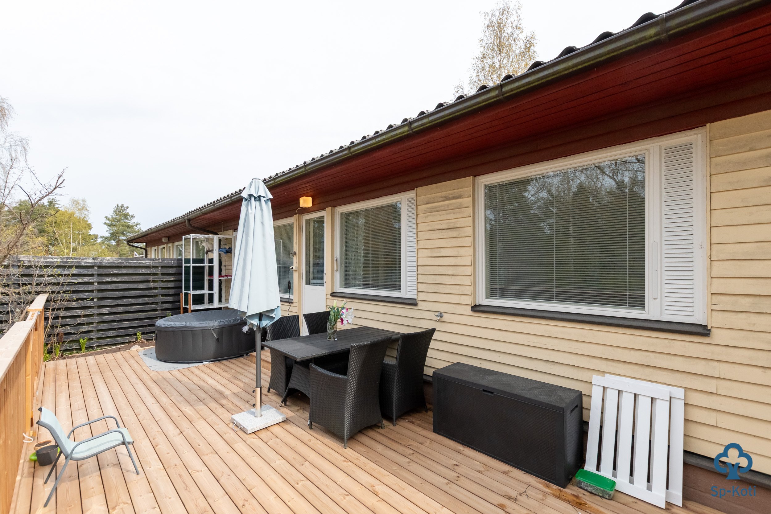 Kodin terassilta pilkottaa merinäköala, joka tuo rauhoittavan lisän asumiseen. Piha-alue on viihtyisä ja tarjoaa mahdollisuuksia ulkoiluun ja vapaa-ajan viettoon.