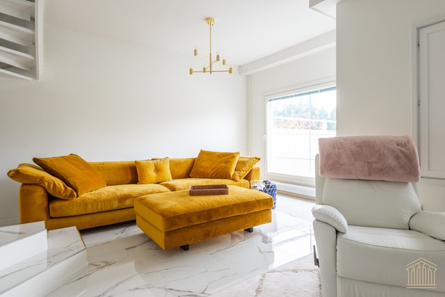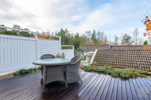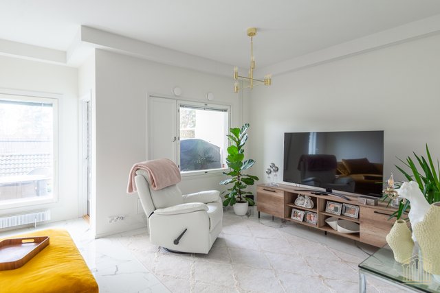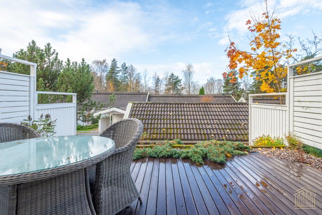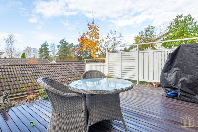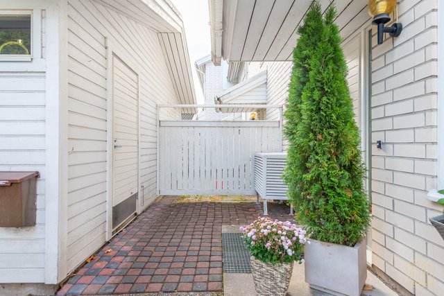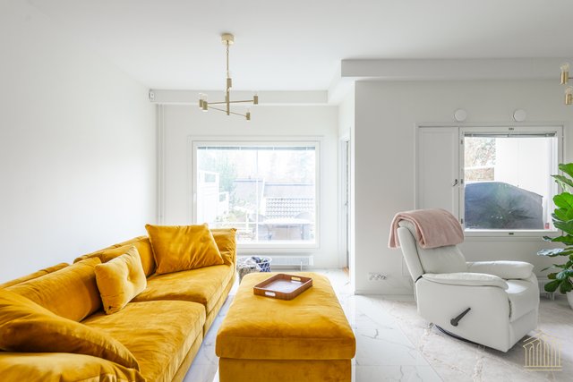 Asunto koostuu avarasta alakerrasta, jossa on olohuoneen lisäksi hyvä paikka ruokailuryhmälle sekä erillinen keittiö, johon mahtuu myös ruokapöytä. Sisään tultaessa avautuu suora näkymä takapihalle ja arvokkuutta tuo muutaman rappusen alempana oleva olohuonetaso. Takapihalla on iso terassi ja todella helppohoitoinen.