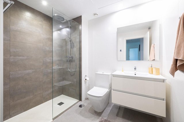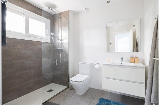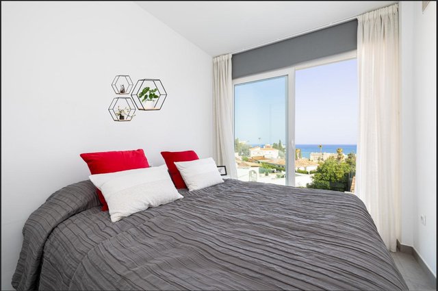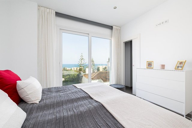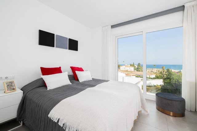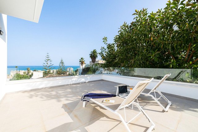 Moving one floor up, you’ll find two bedrooms. The master bedroom is furnished with a walk-in closet, a large en-suite bathroom, and a spectacular sea views, the second bedroom shares a terrace located in the hallway, perfect for enjoying personal space and the amazing views.