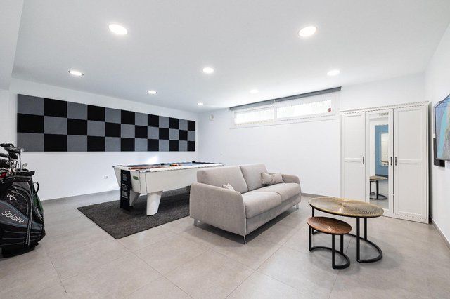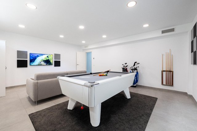 The lower level includes two additional bedrooms, another bathroom, and a game room complete with a billiard table and a cinema. There’s also ample space for storing bicycles or golf clubs.