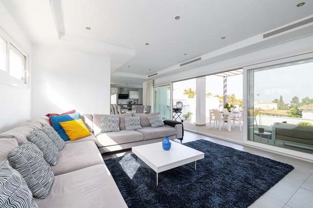 The entrance features a large parking spot for two cars, surrounded by a beautiful garden that connects you to the swimming pool. This luxury, comfortable, and bright villa is ideal for year-round living or as a high-income rental property, located just 500 meters from the beach and a short distance from golf courses.