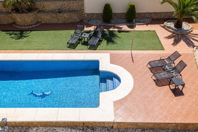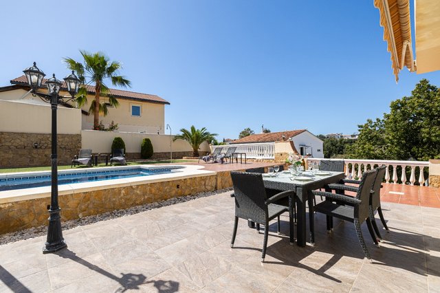 A large terrace overlooking the private swimming pool, perfectly furnished for lounging and entertainment.