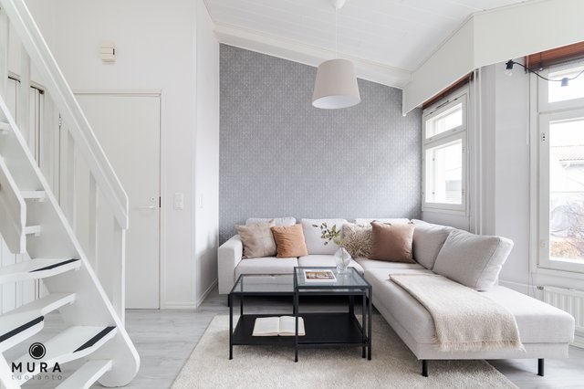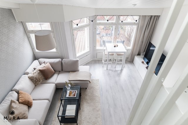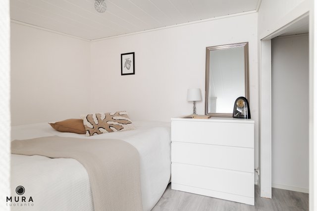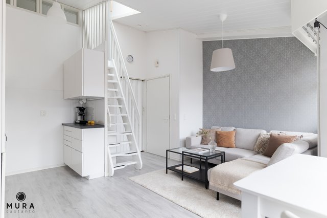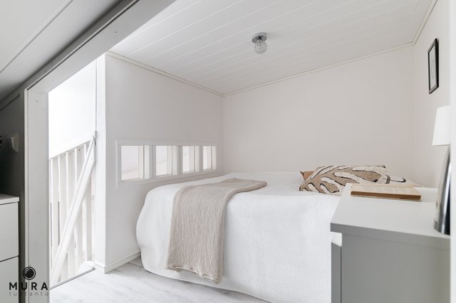Asunnossa on hyvä pohjaratkaisu ja parvi antaa mukavasti lisää käyttöneliöitä. Asunnon avokeittiö on uusittu vuonna 2016 ja se on samaa tilaa valoisan olohuoneen kanssa. Asunnon pesutilat ovat tilavat ja onhan asunnossa toki myös oma sauna. Parvella on tilaa sängylle ja sen lisäksi säilytystilaa. Asunnon piha-alue on todella aurinkoinen ja terassille kelpaa kesäpäivästä nauttia! Pyhäjärvi pilkottaa asunnon ikkunoista ja rantaan onkin todella lyhyt matka.