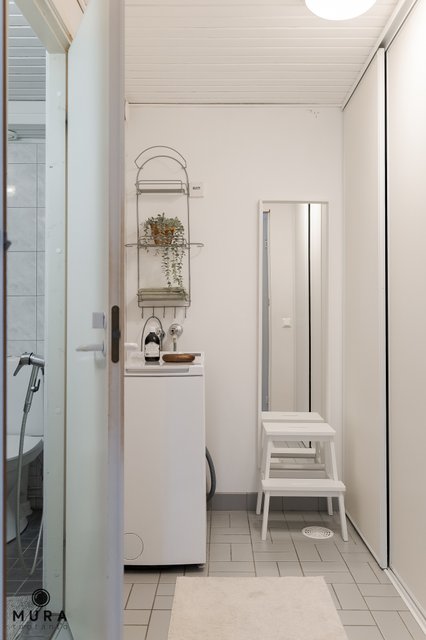 - WC-istuin, suihku, lattialämmitys, peilikaappi, bidee-suihku, allaskaappi, pesukoneliitäntä, ja pesuallas