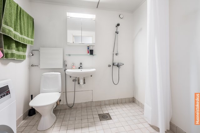 - WC-istuin, suihku, peilikaappi, bidee-suihku, ja pesukoneliitäntä