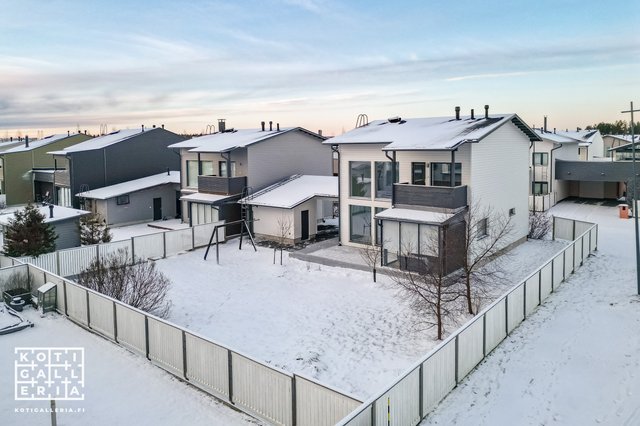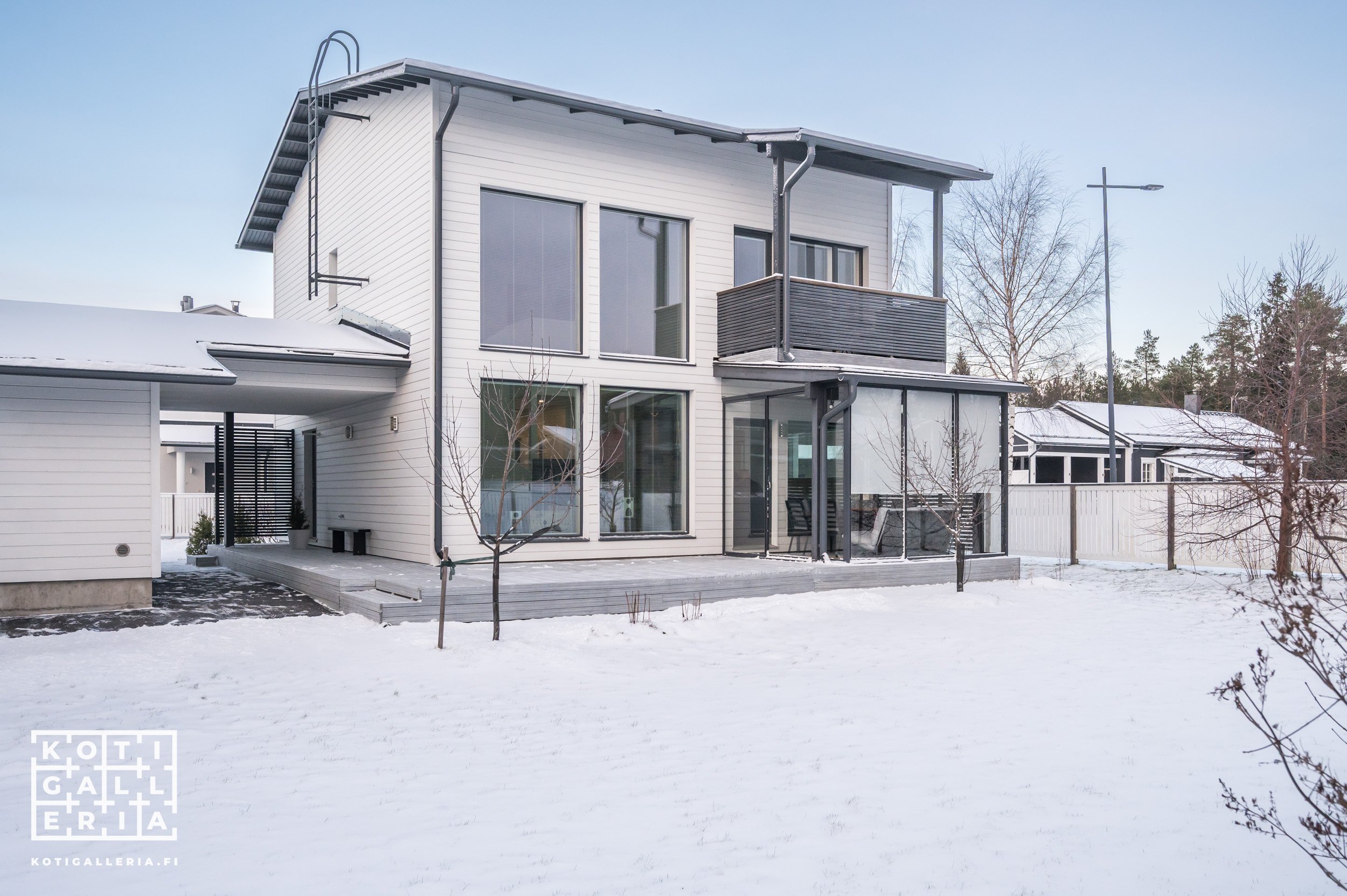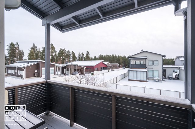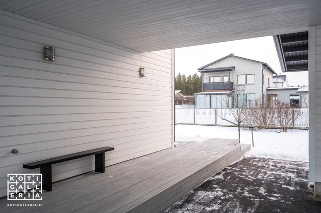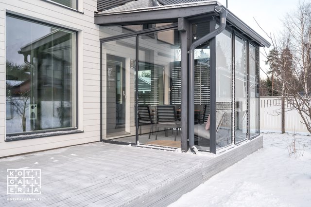 - Taloa kiertää kahdelta sivulta suuri terassi, joka suuntaa etelään. Osa terassista on lasitettu, joten terassia voi hyödyntää alkukeväästä pitkälle syksyyn. Terassin lattiaa lämmittävät termomatot ja terassiverhot tuovat hyvin näkösuojaa.
