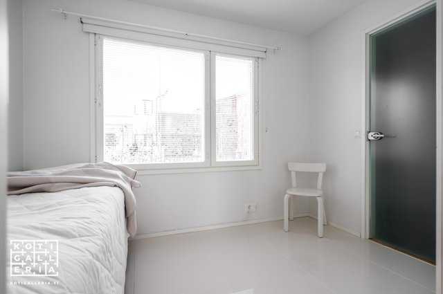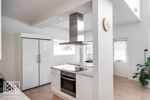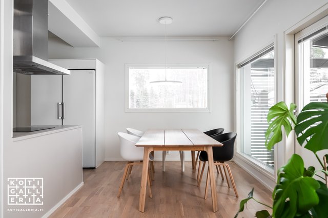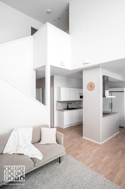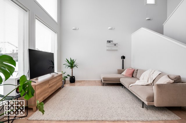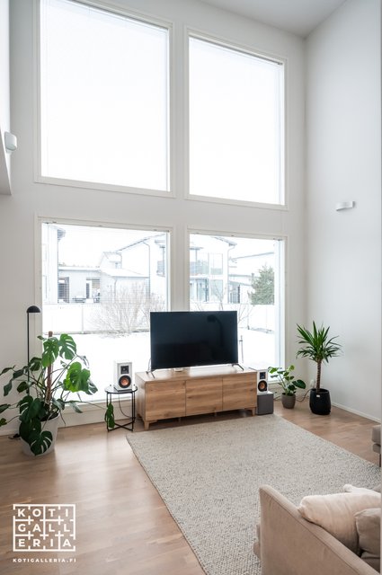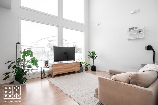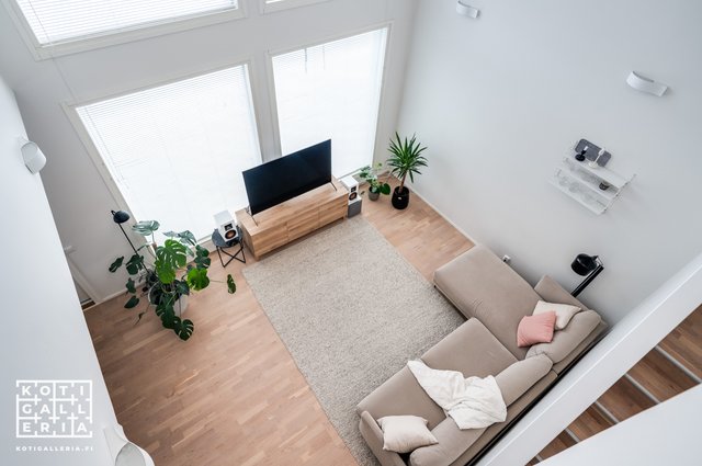 - Korkea huonetila (5,5 m) ja isot ikkunat antavat kivasti tilantuntua ja valoisuutta molempiin kerroksiin