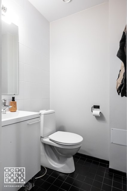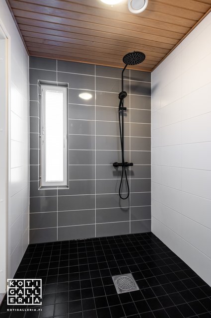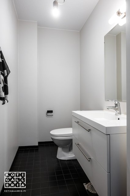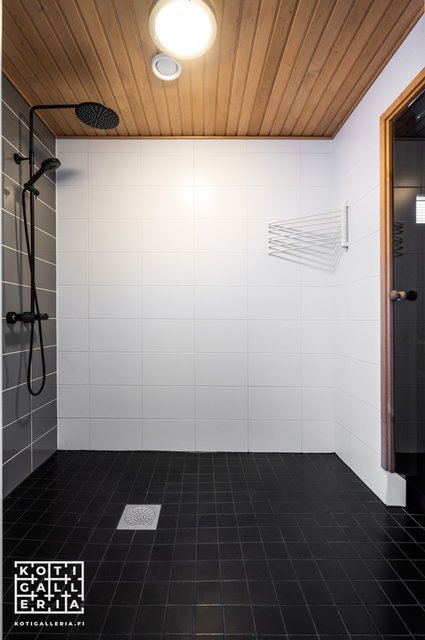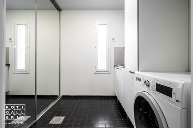 - Pesukoneliitäntä, lattialämmitys, pesuallas, tila pesutornille, ja lattiakaivo