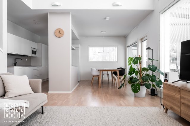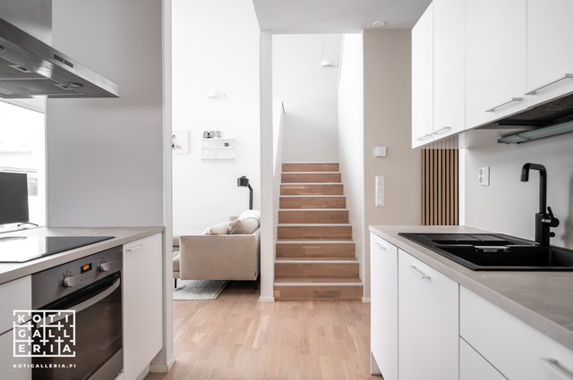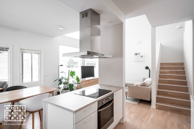 Alakerta hurmaa avaruudellaan: vuonna 2024 uudistettu keittiö ja ruokailutila avautuvat saumattomasti korkeaan, valoisaan olohuoneeseen, jonka suuret ikkunat tulvivat luonnonvaloa sisään. Lisäksi alakerrasta löytyy yksi makuu- tai työhuone, erillinen wc, käytännölliset kodinhoitotilat sekä vuonna 2024 remontoitu saunaosasto.