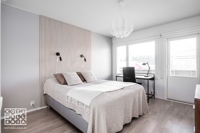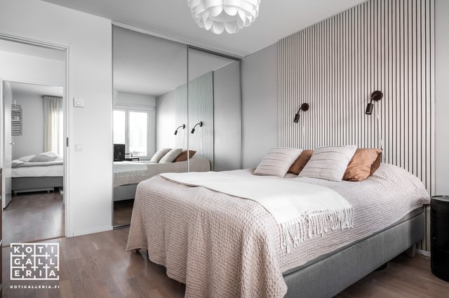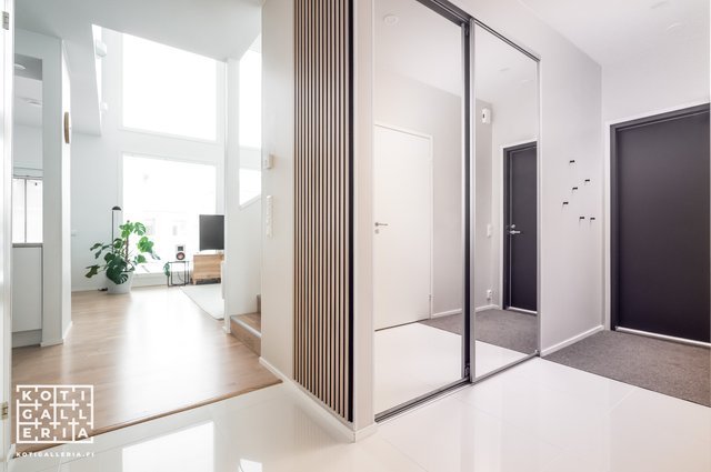 - Tässä kodissa on runsaasti säilytystilaa. Eteisessä on peililiukuovet, joiden takana on säilytystilaa korotettuun huonekorkeuteen saakka. Jokaisessa kahdessa makuuhuoneessa ja yhdessä työhuoneessa on kaapistot. Kolmannessa päämakuuhuoneessa on peililiukuovet, jotka kätkevät sisäänsä suuren säilytystilaratkaisun. Lisäksi portaiden alle on jätetty tilaa säilytykselle.