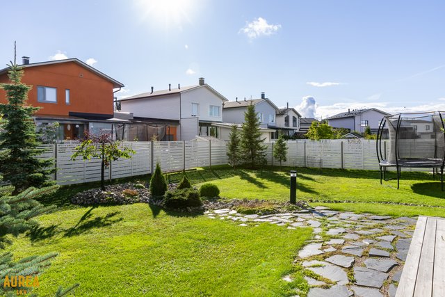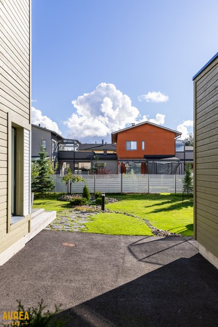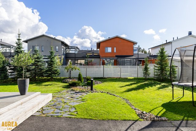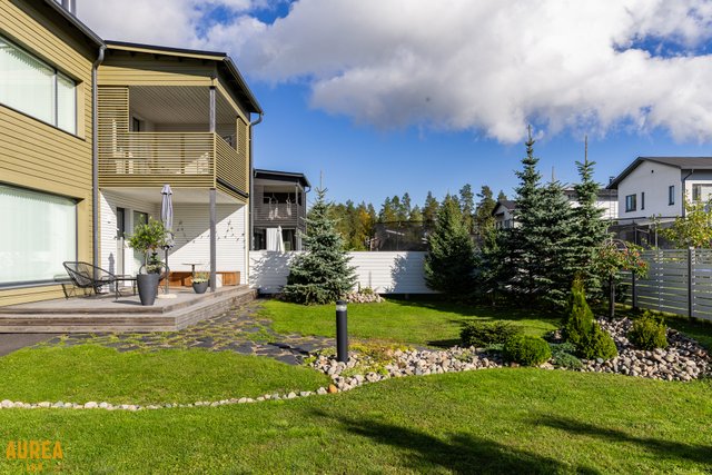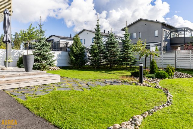 Pihapiiri on viimeistelty ja viihtyisä. Pihalle siirretyt suuret puut ja aidat tuovat yksityisyyttä, ja lisäksi kauniit kivipenkit sekä havu- ja kivikkokasvit luovat vehreää tunnelmaa.