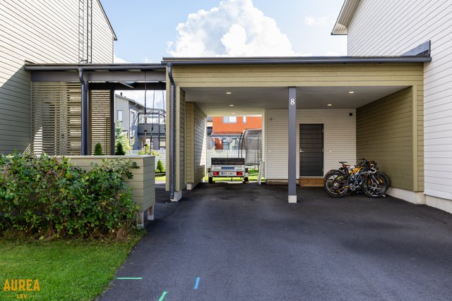 Autolle löytyy tilava ja korkea kahden auton katos, johon mahtuu helposti myös suurempi ajoneuvo, kuten asuntoauto. Lisäksi pyörille ja muille tarvikkeille on runsaasti suojaisaa tilaa.