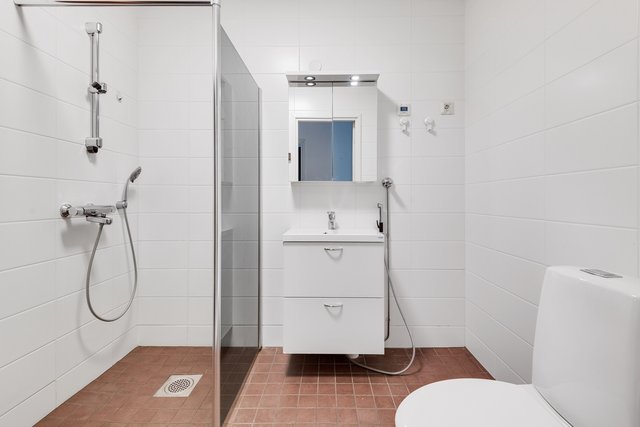 - WC-istuin, suihku, pesukoneliitäntä, lattialämmitys, suihkuseinä, allaskaappi, bidee-suihku, ja peilikaappi