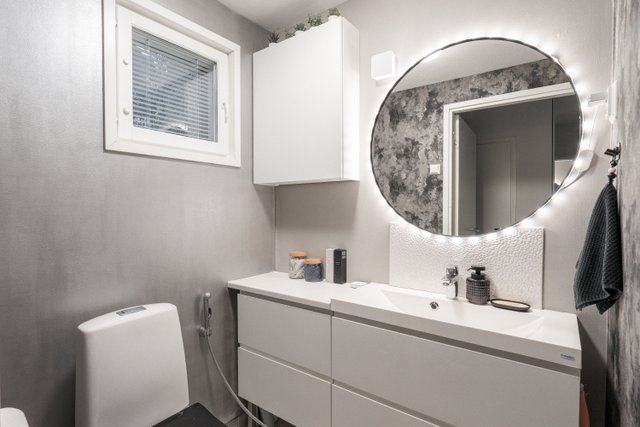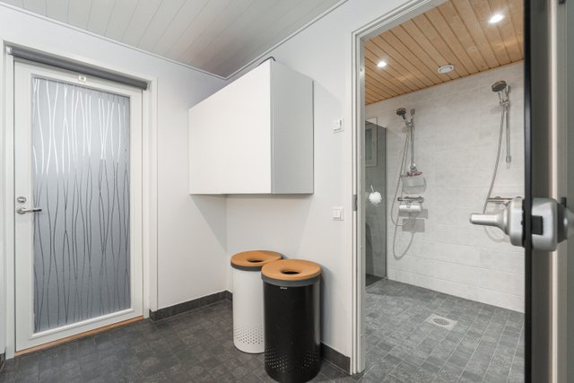 Erillinen kodinhoitohuone ja kaksi wc.tä tuovat arkeen toimivuutta ja kaksi suihkua ja oma sauna pientä luksusta. Säilytystilaa löytyy niin isosta vaatehuoneesta, kaapistoista kuin varastostakin. Talon lämmitysmutona on suora sähkö ja sitä tukevat ilmälämpöpumppu ja varaava takka. Asunnon kokonaissähkönkulutus onkin kokonaisuuden ansiosta kohtuullista.