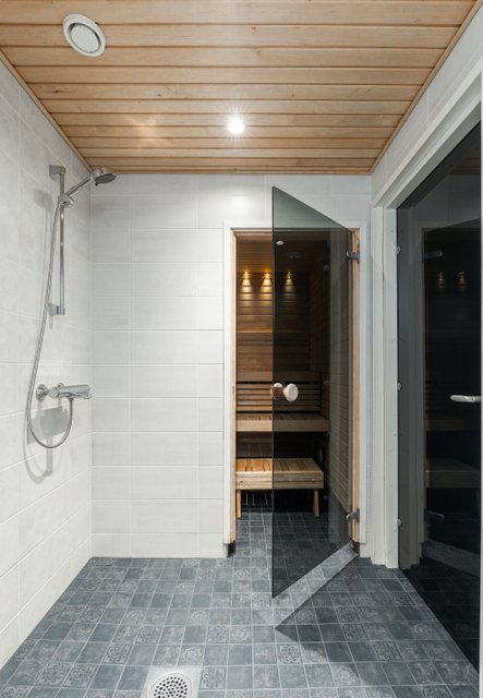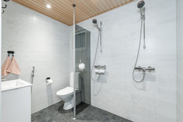 - WC-istuin, suihku (x2), suihkuseinä, allaskaappi, pesuallas, ja peili