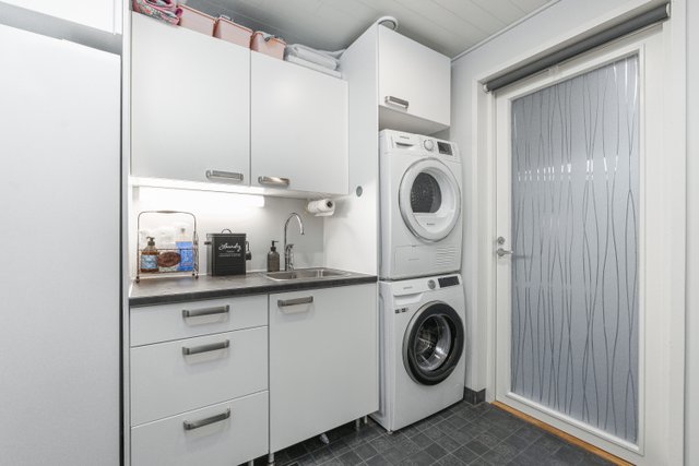 - Pesukoneliitäntä, pyykkikaapit, pöytätaso, ja tila pesutornille