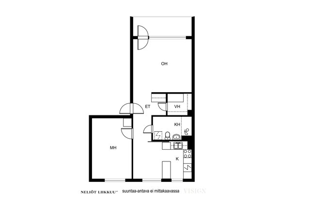 Tilava kaksio tarjoaa toimivan pohjaratkaisun: erillinen keittiö, reilunkokoinen olohuone, makuuhuone sekä vaatehuone antavat monipuolisesti tilaa arkeen. Lasitettu parveke tuo lisäneliöitä ja kutsuu nauttimaan rauhallisista hetkistä ulkona.