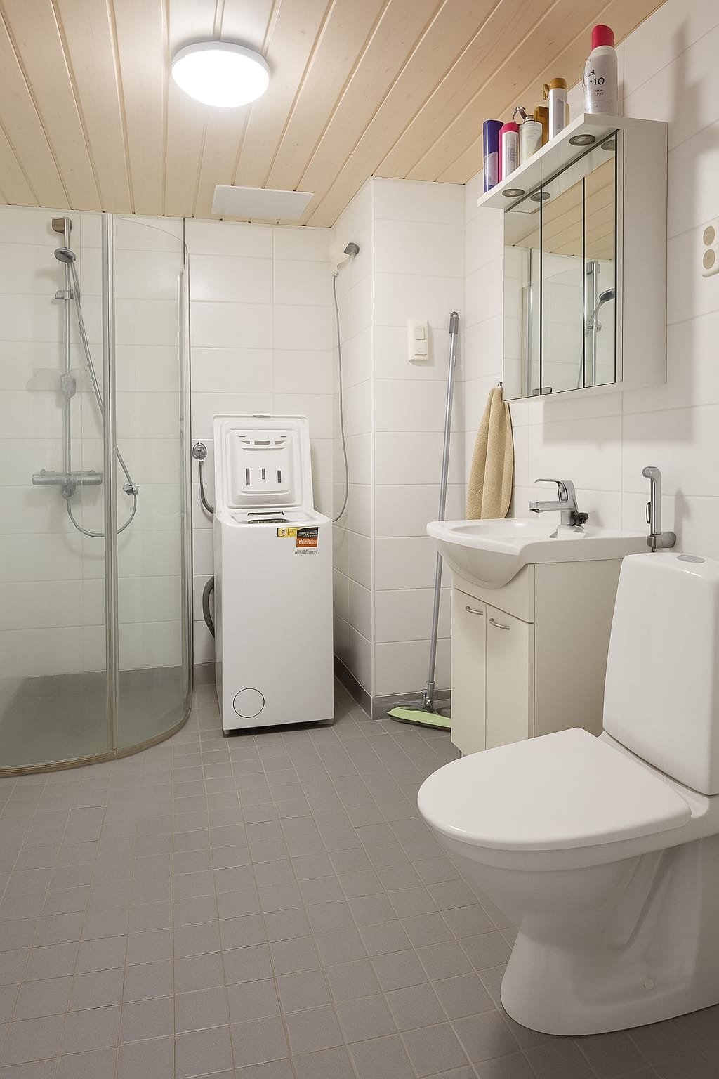 - WC-istuin, suihku, pesukoneliitäntä, lattialämmitys, ja allaskaappi