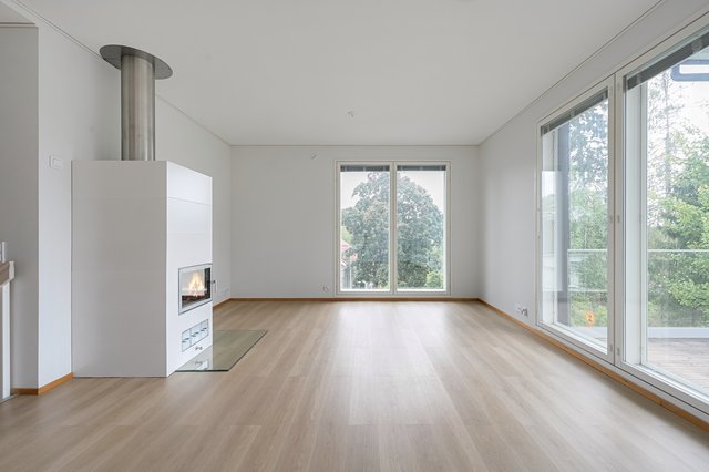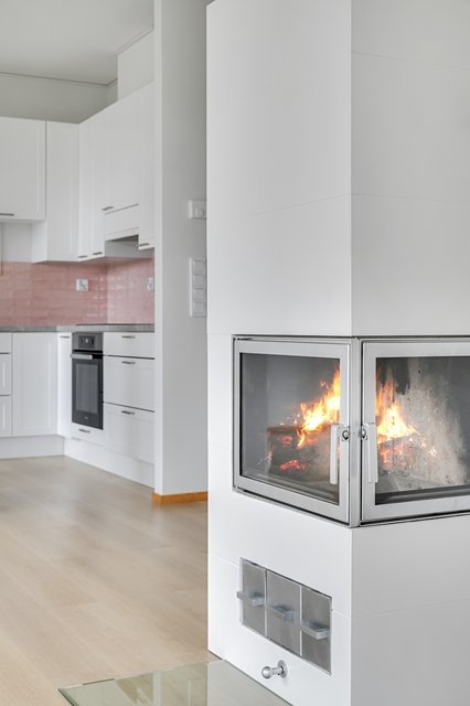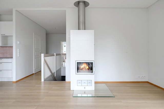 Avarat ja korkeat huoneet täyttyvät luonnonvalolla, luoden kotiin kutsuvan ja lämpimän tunnelman. Olohuoneen sydämenä toimii varaava takka, joka tuo lisälämpöä ja tunnelmaa kylmiin iltoihin. Näin myös lämmityskustannukset pysyvät yhdessä poistoilmalämpöpumpun kanssa hyvin kohtuullisina.