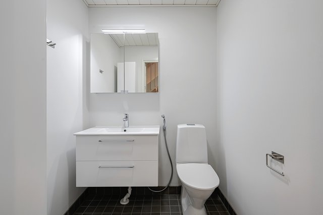 - Alakerran wc:n varustus: wc-istuin, bideesuihku, peilikaappi, allaskaappi, kaapisto. Lattia: laatta. Seinät: maalattu.