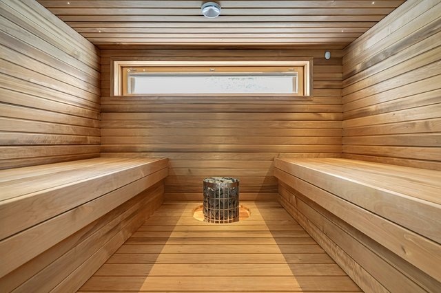 - Sähkökiuas. Saunassa lasiseinät ja Harvian pilarikiuas. Lattia: laatta. Seinät: puu.