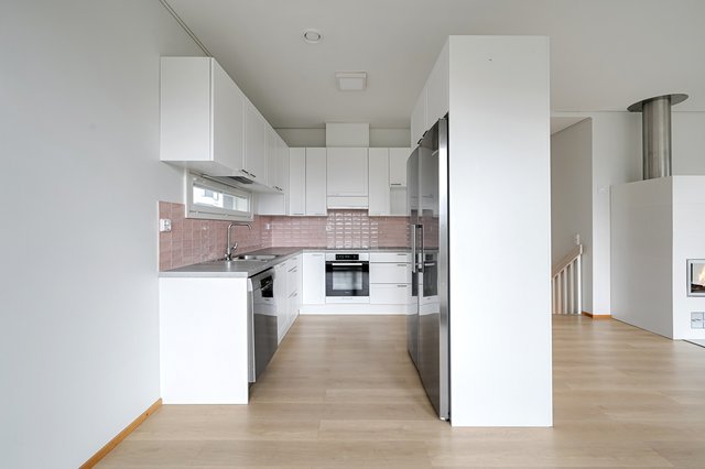 Olohuoneen suurista ikkunoista on hienot näkymät kauas yli kattojen. Keittiö on modernin kodin sydän, varustettuna laadukkailla kodinkoneilla ja runsaalla työtilalla, mikä tekee ruoanlaitosta nautinnon.