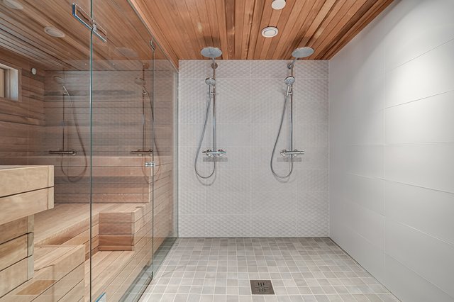 Alakerrasta löytyy lisäksi erillinen wc, tilava kodinhoitohuone, sekä upeat suihkutilat ja lasiseinällä sekä tyylikkäällä Harvian pilarikiukaalla varustettu ikkunallinen sauna. Kuin kodinhoitohuoneesta, että varastosta on kätevästi suora kulku ulos.
