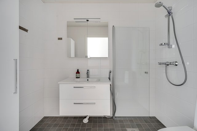 - Yläkerran kylpyhuoneen varustus: suihku, käännettävä suihkuseinä, peilikaappi, allaskaappi, kaapisto, wc-istuin, bideesuihku, lattialämmitys. Lattia: laatta. Seinät: kaakeli. Alakerran kylpyhuoneen varustus: 2 x suihku/sadevesisuihku. Lattia: laatta. Seinät: kaakeli.