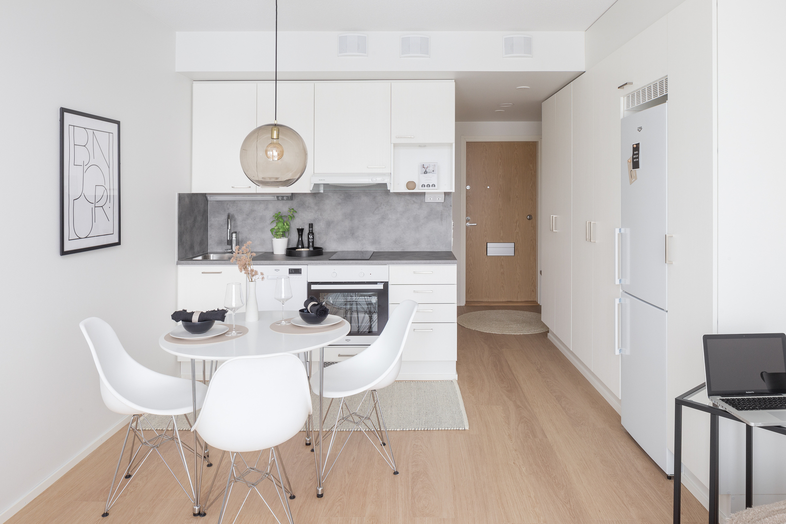 - Kaappien ovet ovat valkoisia, puusyykuvioisia mikrolaminaattiovia. Työtasot ovat laminaattipintaisia. Keittiöissä on kalusteuuni ja 2 tai 4 -osainen induktiotaso, liesikupu, jää-/pakastinkaappi astianpesukone sekä varaus mikroaaltouunille.