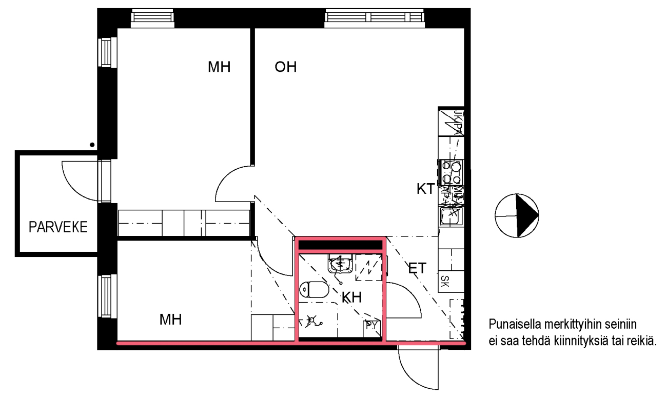 - Asuintilojen seinät on maalattu. Keittiöissä työpöytien ja kaapistojen välissä on laminaatti. Kylpyhuoneiden seinissä on keraamista laattaa.