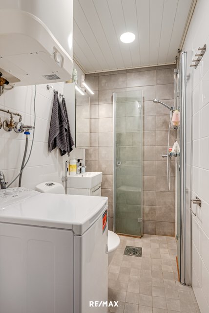 - WC-istuin, suihku, suihkuseinä, pesukone, pesukoneliitäntä, peilikaappi, bidee-suihku, allaskaappi, ja pesuallas