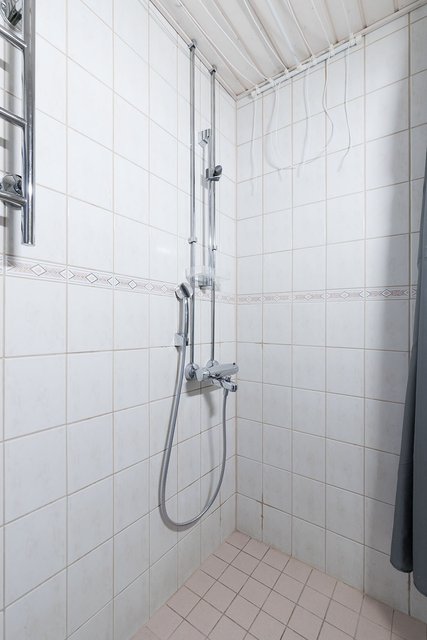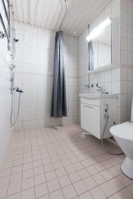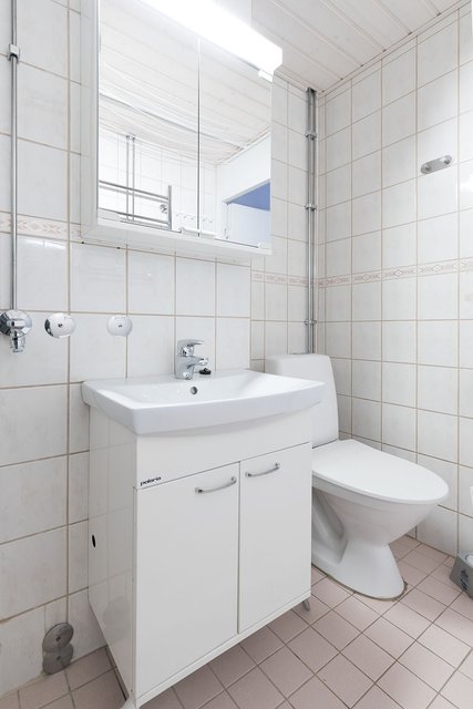 - WC-istuin, suihku, bidee-suihku, peilikaappi, pesuallas, allaskaappi, ja pesukoneliitäntä