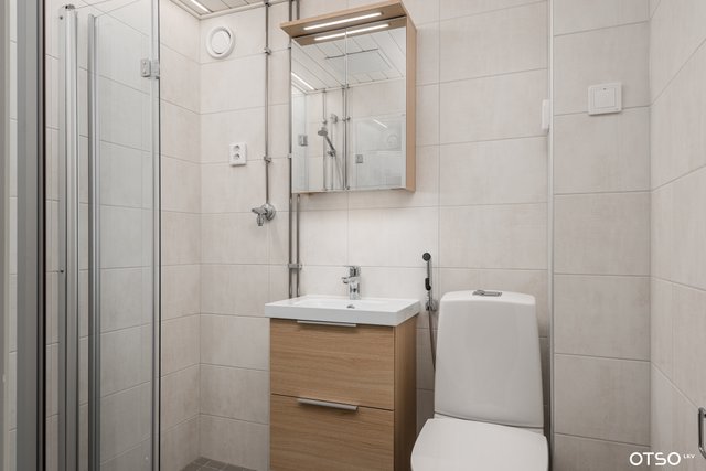- WC-istuin, suihku, suihkuseinä, pesukoneliitäntä, lattialämmitys, peilikaappi, pesuallas, ja bidee-suihku