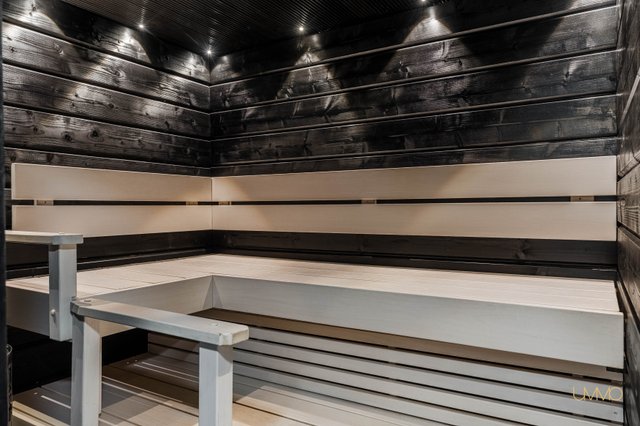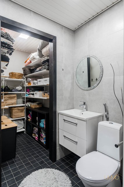 Asumismukavuutta lisäävät erillinen wc sekä saunaosasto, joka tarjoaa mahdollisuuden rentoutumiseen kiireisen päivän päätteeksi. Lämmitysjärjestelmä koostuu aurinkopaneeleista, sähköstä ja ilmalämpöpumpusta, mikä tekee asumisesta energiatehokasta.