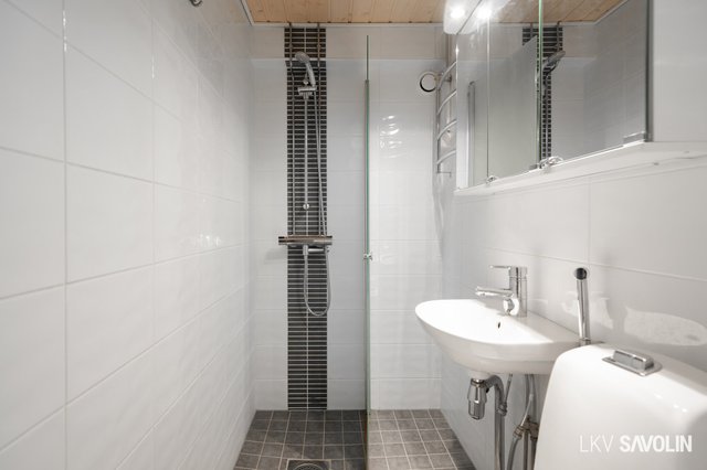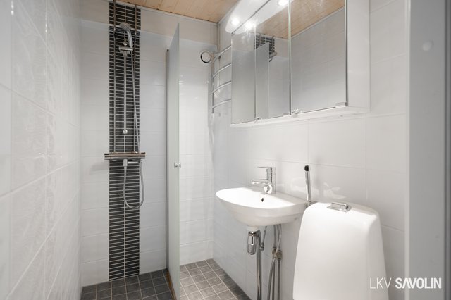 - WC-istuin, suihku, suihkuseinä, pesukoneliitäntä, peilikaappi, pesuallas, ja bidee-suihku