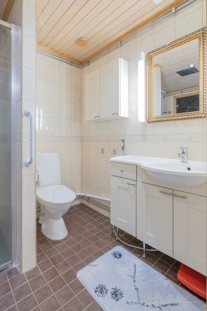 - WC-istuin, suihku, pesukoneliitäntä, lattialämmitys, pesuallas, allaskaappi, bidee-suihku, suihkuseinä, peili, ja seinäkaapit