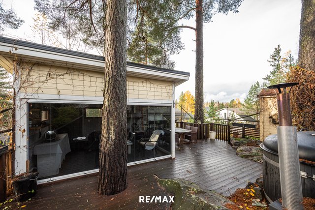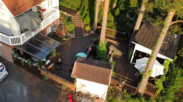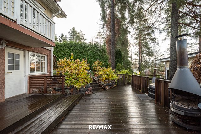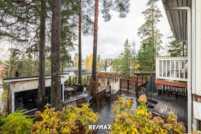 - Koko tontin pinta-ala on kiinteistörekisteriotteen mukaan 1520 m2. Kiinteistö on jaettu hallinnanjakosopimuksella kahdelle määräosalle A ja B. Myynnissä on määräosa B 740/1520. Omakotitalo sijaitsee mäen päällä. Talon takapihalla on terasseja useammassa tasossa, jotka laskeutuvat kesäpaviljonkia kohti. Takapiha-alue on kokonaan aidattu. Porteista pääsee niin kadulle kuin yläpihan varastolle / autokatokselle sekä pysäköintialueelle, joka on asfaltoitu. Nykyinen omistaja on onnistunut optimoimaan rinnetontin luomalla helposti kunnossapidettäviä terassioleskelualueita ja säilyttämällä helppohoitoisia puita ja pensaita, jotka tekevät terassipihasta kuitenkin luonnonmukaisen näköisen ja suojaisan. Parvekkeella ja terassilla voi nauttia auringosta ja kesäpaviljongissa viihdyt kesäiltoina takkatulen äärellä hyttysiltä suojassa. Miksi ei kylmenevinä syysiltoinakin? Yläpihalla lapsia ilahduttaa ihana "hobitti"-mökki.