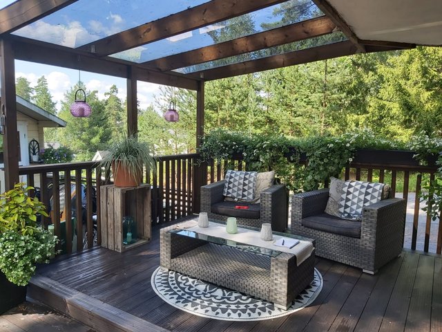 Pihalla aurinko kulki pitkin 120 neliön terasseja, ja jokainen nurkka kutsui oleskelemaan – välillä kahvikupin kanssa, välillä lasten leikeissä mukana. Oma tonttiosuus ja aidattu turvallinen piha tarjosi rauhaa ja tilaa hengittää, ja puusto kätki suojaansa sekä lintujen laulun että kiireettömyyden.